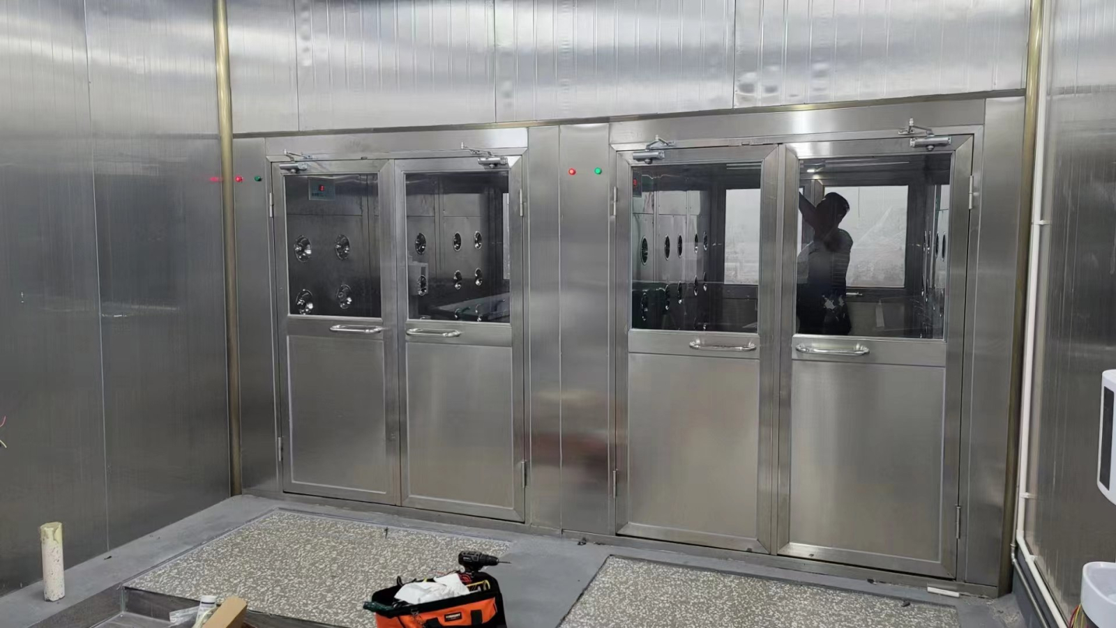 Vào Buồng: Nhân viên bước vào Air Shower, cửa thứ nhất tự động đóng lại và khóa kín.
